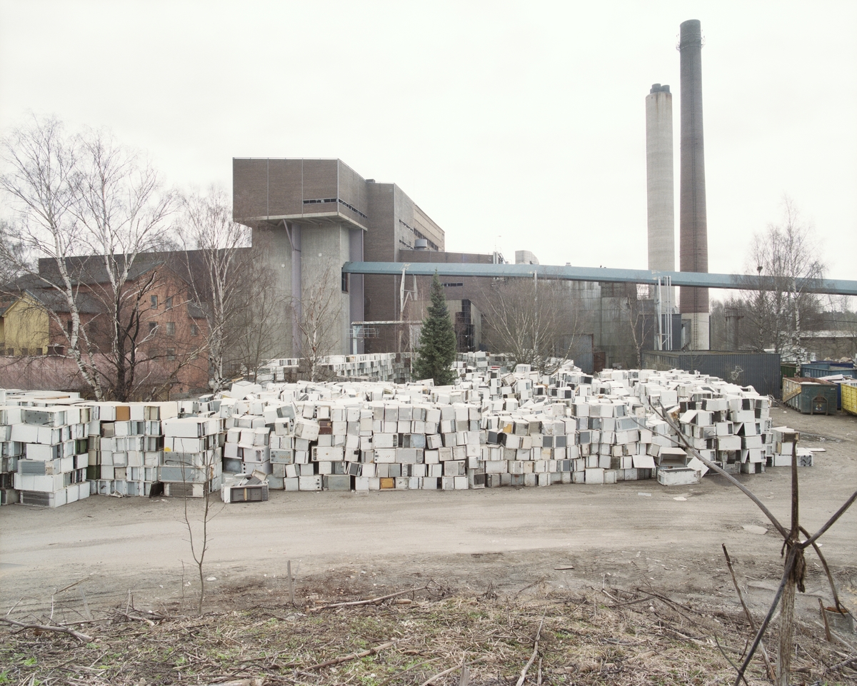 Bildtext: Kyl & frysskåp i väntan på återvinning med sopförbränningsanläggningen i bakgrunden.