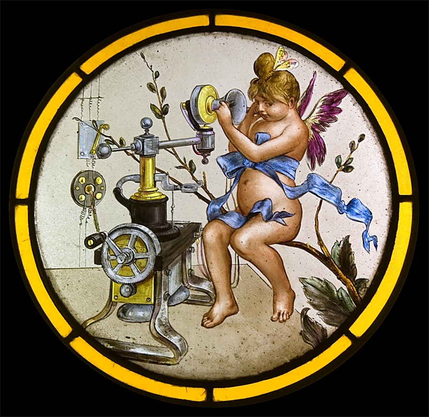 Glasmålning från 1880-talet av Vicke Andrén som en gång prytt trapphuset i Stockholms Allmänna Telefonaktiebolags lokaler på Malmskillnadsgatan i Stockholm.