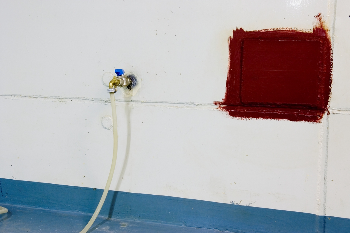 Bilden föreställer: Plan 04 reaktorbyggnaden rum 0421. Avtappningskran för bergvatten utanför det täta skalet av 4 mm tjock plåt samt en lagning av det täta skalet. Detta är något som Åke Bergman sett till att göra på senare tid för att inte byggnaden skall förstöras. Förklaring av system framgår av rapport :Statens Vattenfallsverk A23/60 5/4 1960.