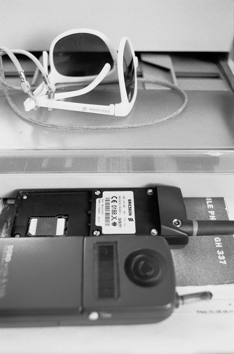 På Britts skrivare: solglasögon och mobiltelefon. Distansarbete intervju nr 13A.