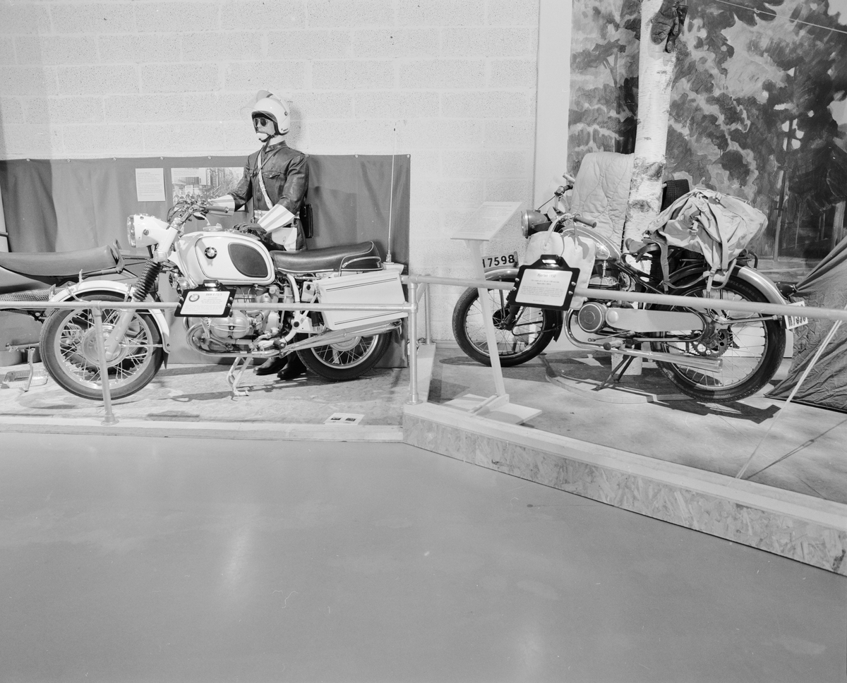 Dokumentation av "Motorcykeln 100 år" i Wallenberghallen. Motorcyklarna, BMW polis-MC och Hjorten 125 cc årsmodell 1950.