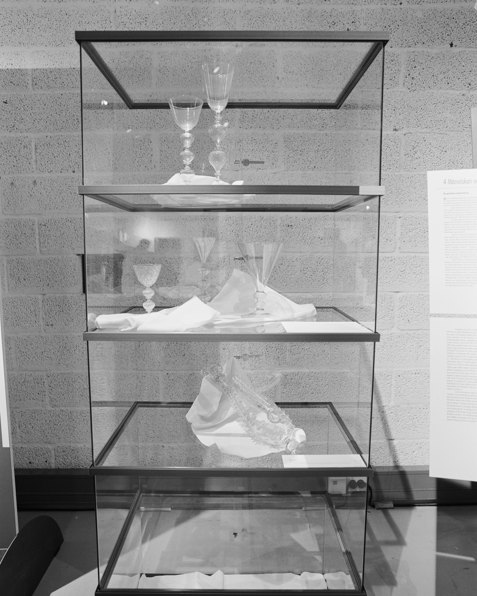 "Vallonien på Louis De Geers tid och idag" utställningen. Glastillverkning. Monter med 5 st glas och en vattenbarometer i genom- skinligt glas från slutet av 1600-tal.