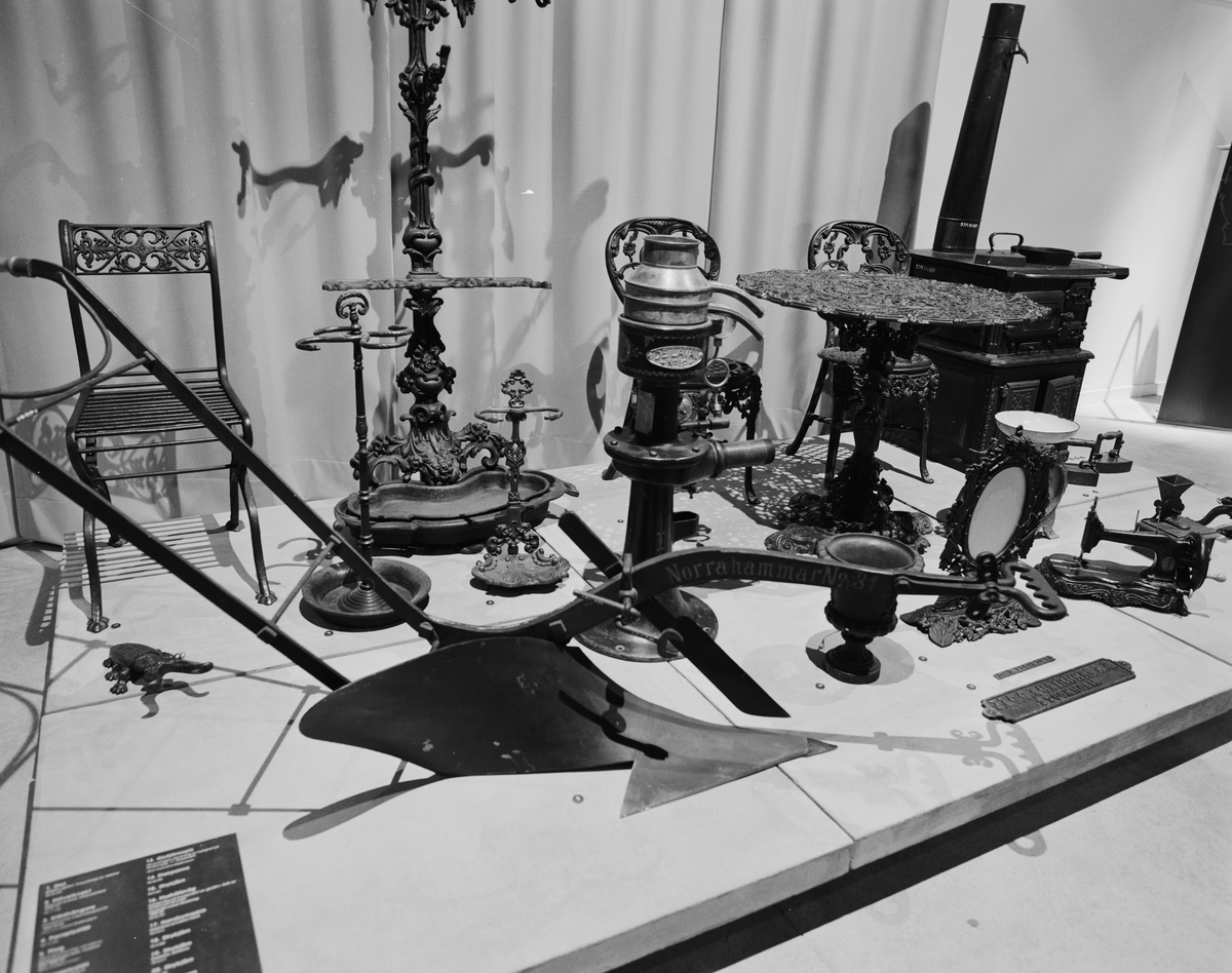 Dokumentation av Ferrum. Gjutjärnsmonter, plog, stol, bord, spis, klädhängare och ram.