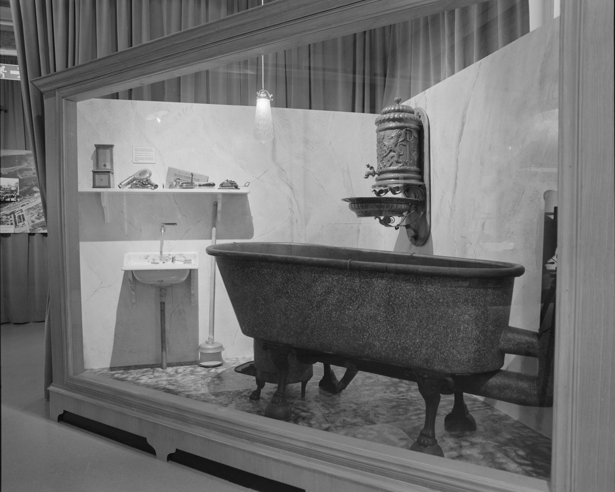 Dokumentation av utställningen "Teknikens under för 100 år sedan", Elkraftsmuseet. Monter med badkar, tvättställ och varmvattenberedare m.m.