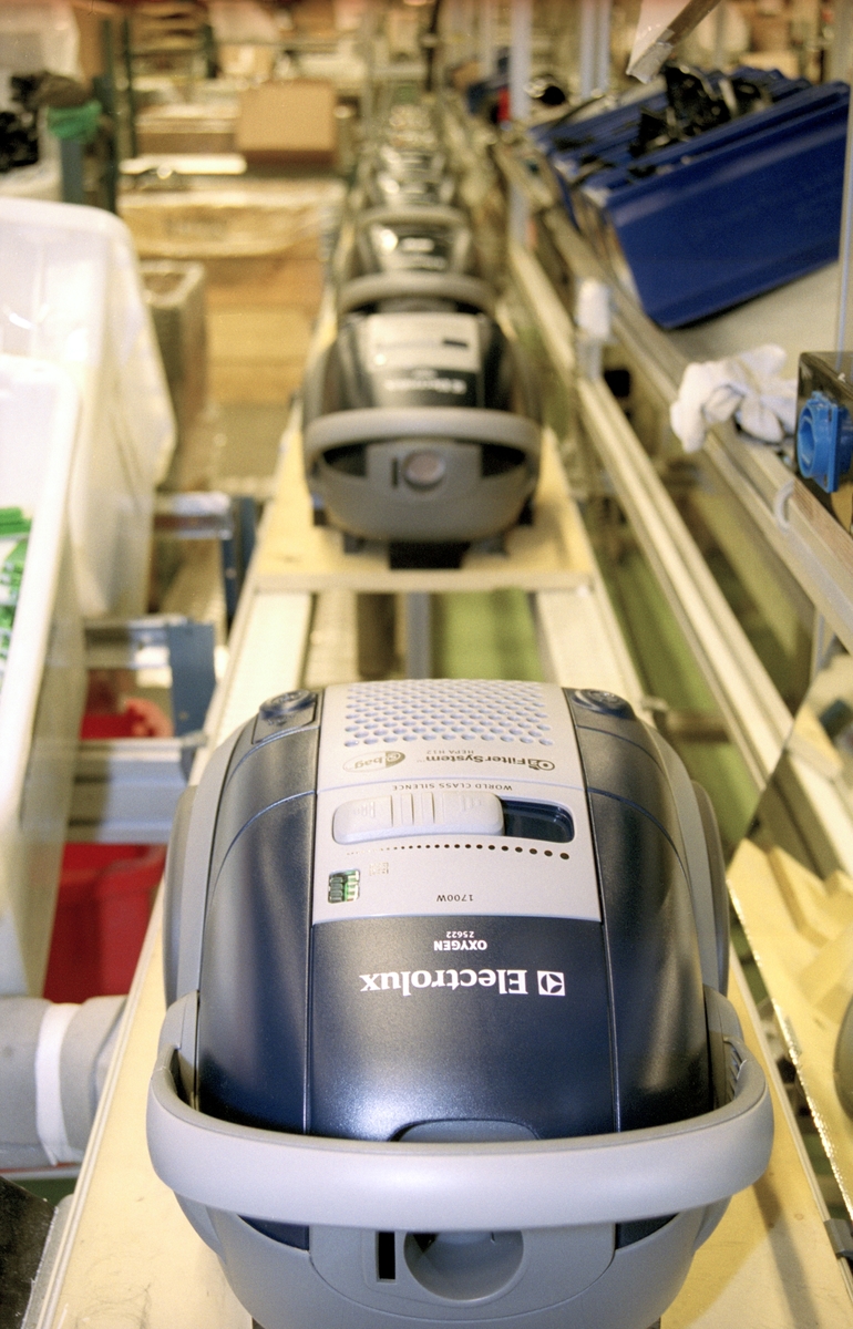 Dokumentation av dammsugartillverkning på Electrolux i Västervik. Bildtext: Montering av dammsugaren Oxygen. Detta är i slutet av monteringslinan och dammsugaren är i stortsett klar.