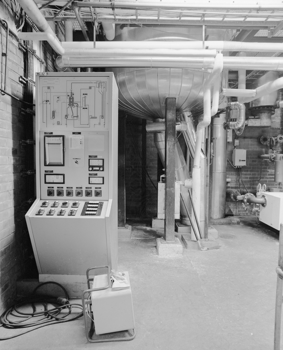 Destillations anläggningen. Manöverpulpeten och botten på destillationstanken, Den är 4 våningar hög.