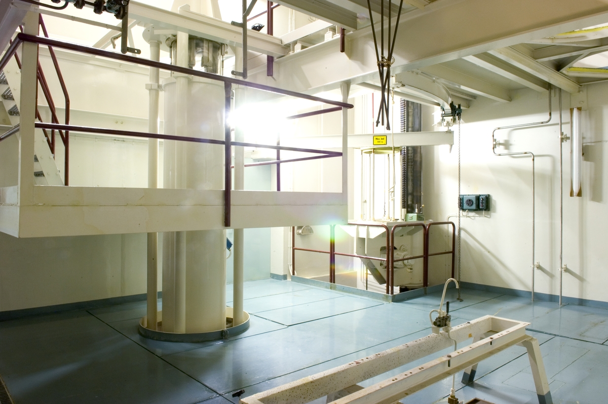 Bilden föreställer: Plan 15 rum 1515 laddmaskinens serviceutrymme.Testrigg med 4 stycken avhägningskrokar för komponenter: bränsleelement, styrdon och proppar. Dessutom finns en position för laddmaskinsgrip. Här kan man studera gripfunktionen. Förklaring av system framgår av rapport :Statens Vattenfallsverk A23/60 5/4 1960.