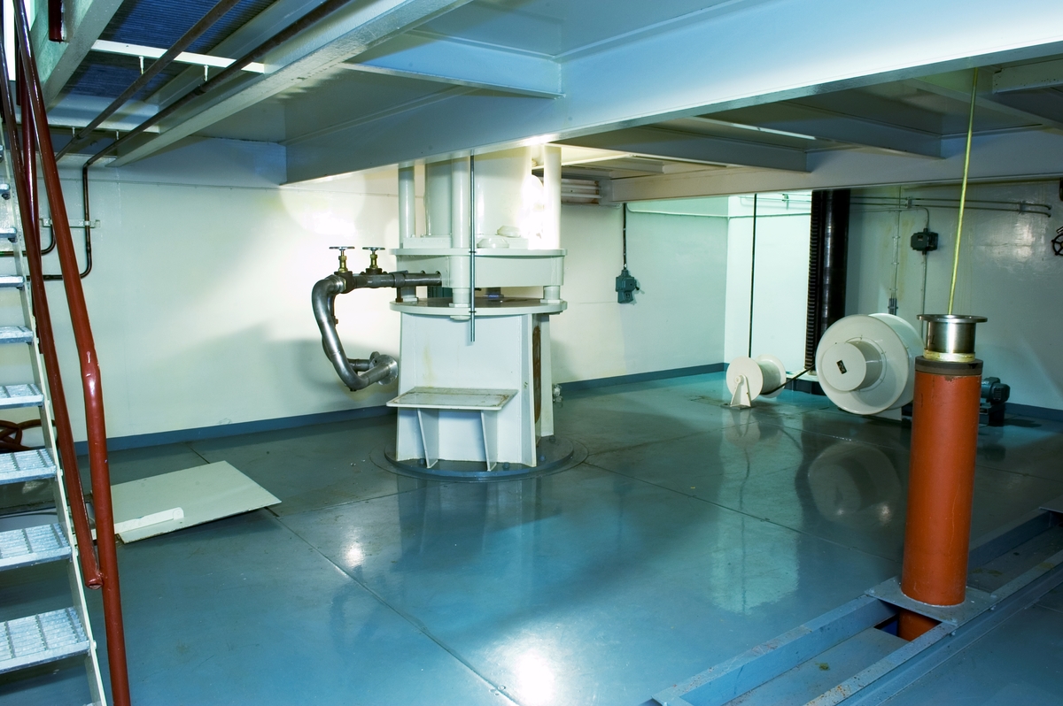 Bilden föreställer: Plan 13 rum 1315 laddmaskinens serviceutrymme nedersta planet.Testriggens bottendel med instyrningskonor för bränsleelement och anslutningar för varmvatten. Längst bort i bild syns lintrumma som ingår i serviceriggen för laddmaskin. Från detta plan finns strålskyddsdörr till bränslebrunnar som inte syns på bilden. Installationer: P209. Förklaring av system framgår av rapport :Statens Vattenfallsverk A23/60 5/4 1960.