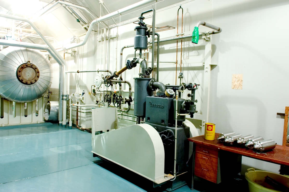 Bilden föreställer: Plan 26 RB rum nr. 2661 expansionsutrymme. Kompressorutrustning som användes vid tömmning och torkning av systemen. På bänken ligger tätningspluggar som användes vid tätning av bränsleelementsposition i reaktortank när ändring av antalet bränsleelement gjordes. Förklaring av system framgår av rapport :Statens Vattenfallsverk A23/60 5/4 1960.