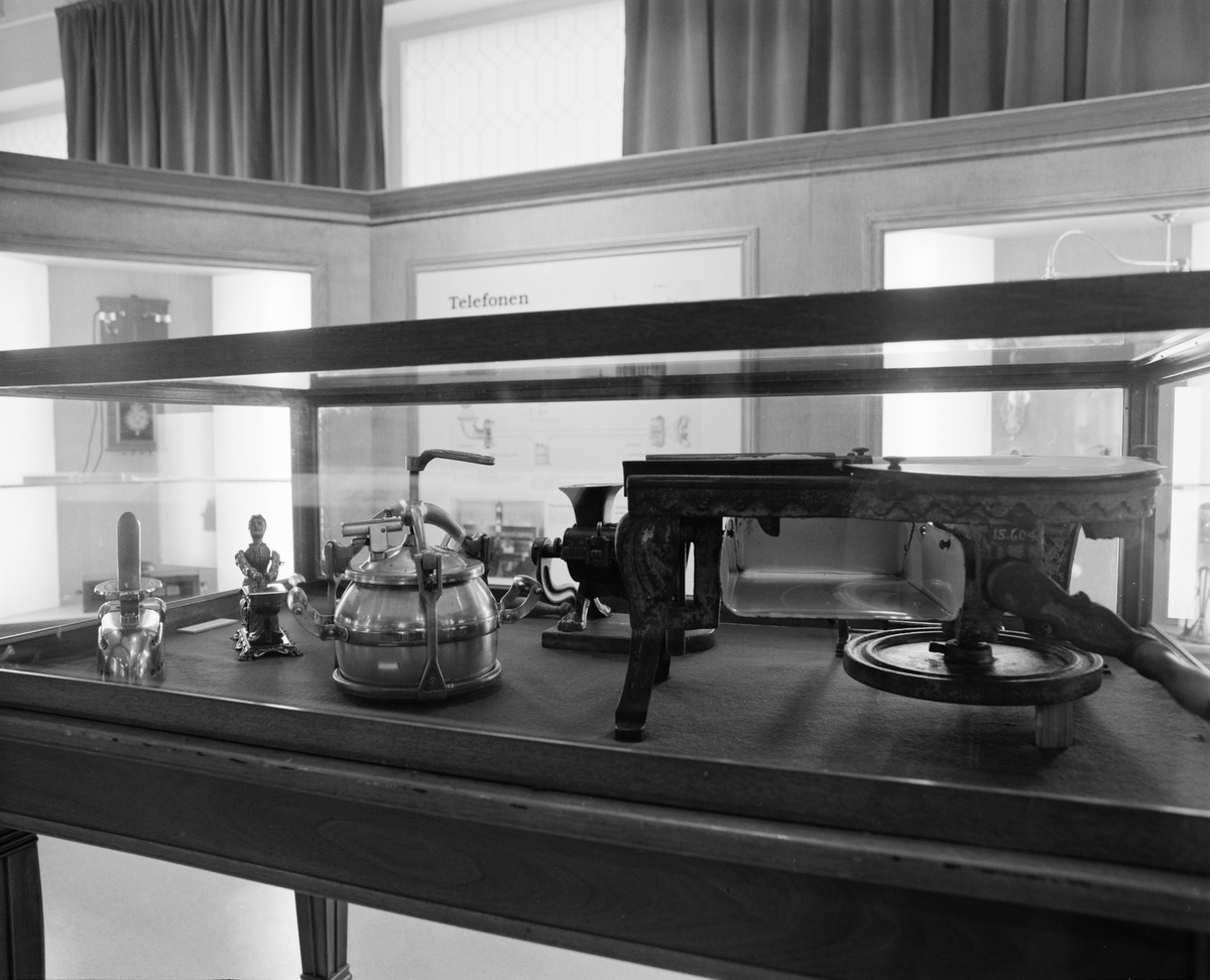 Dokumentation av utställningen "Teknikens under för 100 år sedan", Elkraftsmuseet. Monter med tekniska föremål tryckkokare, köttkvarn m.m.
