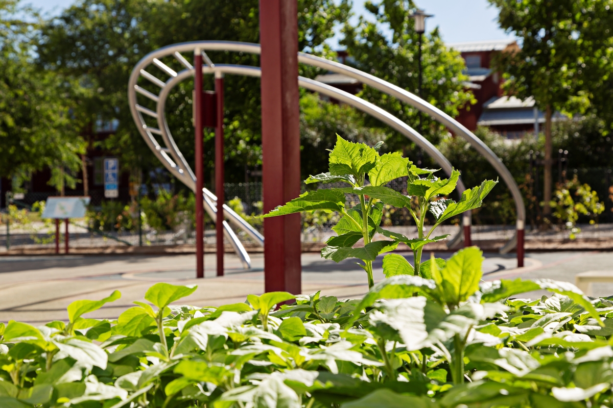 Tekniska museet, exteriör med matematikträdgård och växter.