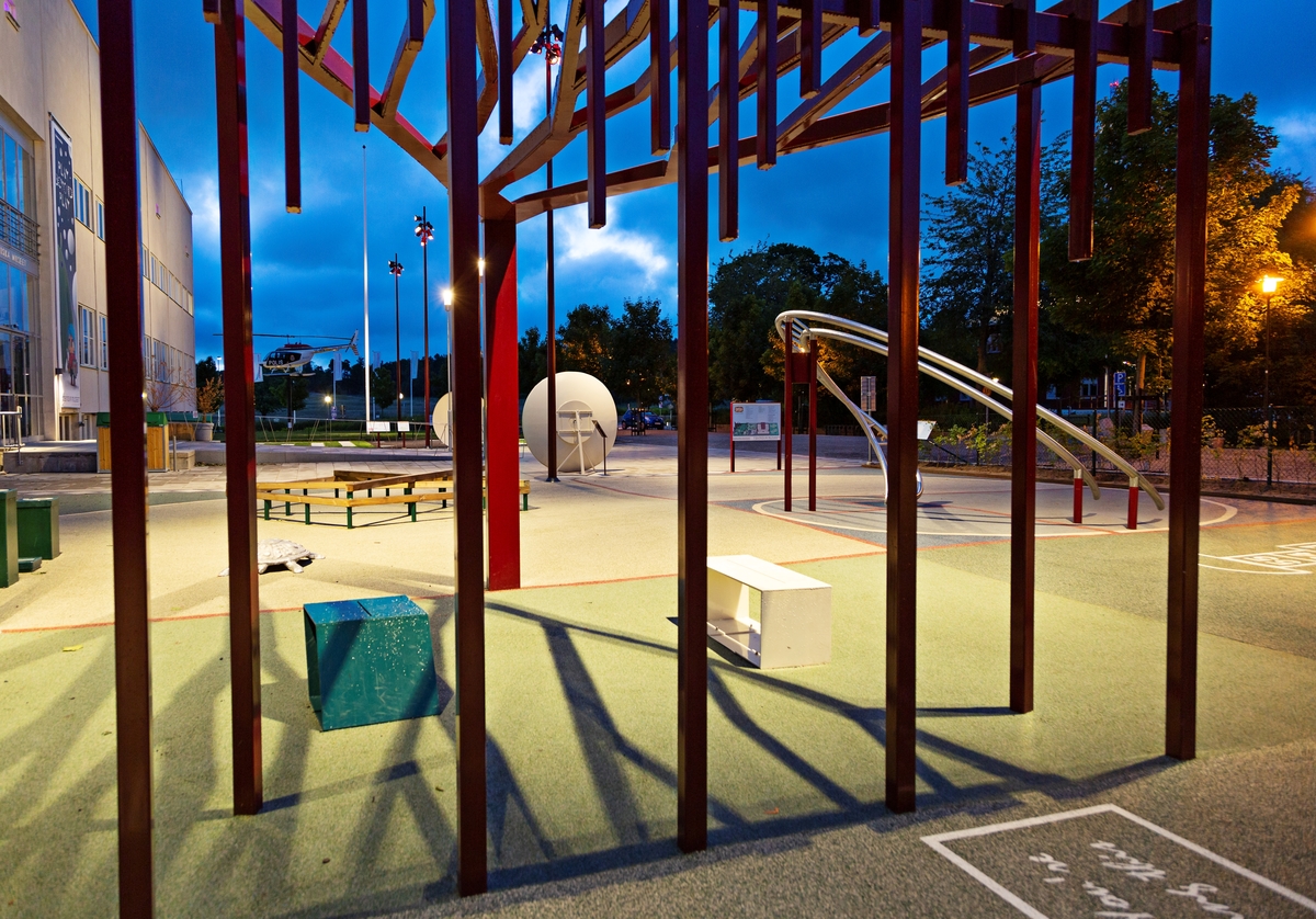 Tekniska museet, exteriör med matematikträdgård på kvällen.