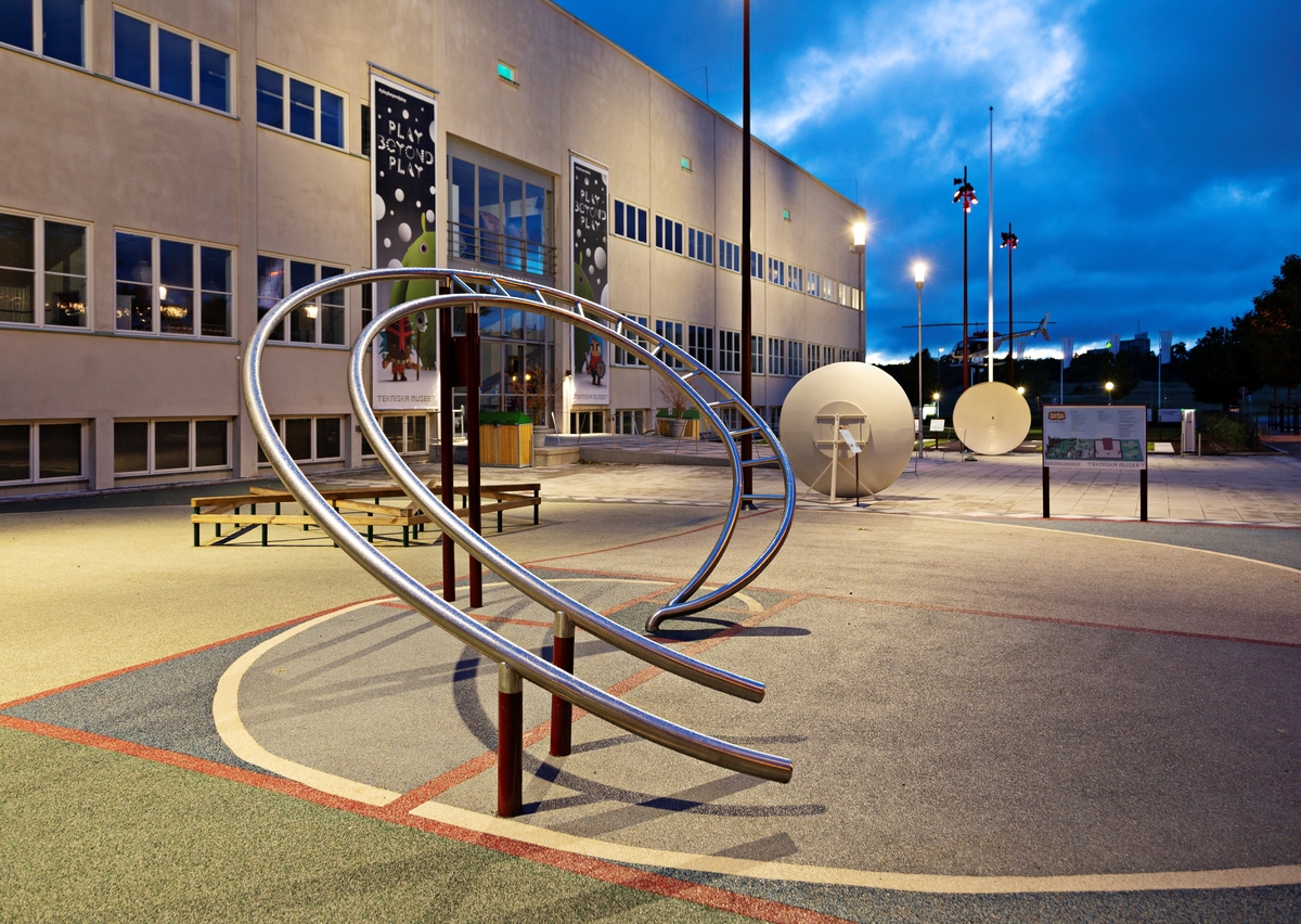 Tekniska museet, exteriör med matematikträdgård på kvällen.