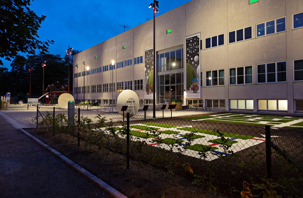 Tekniska museet, exteriör med matematikträdgård på kvällen.