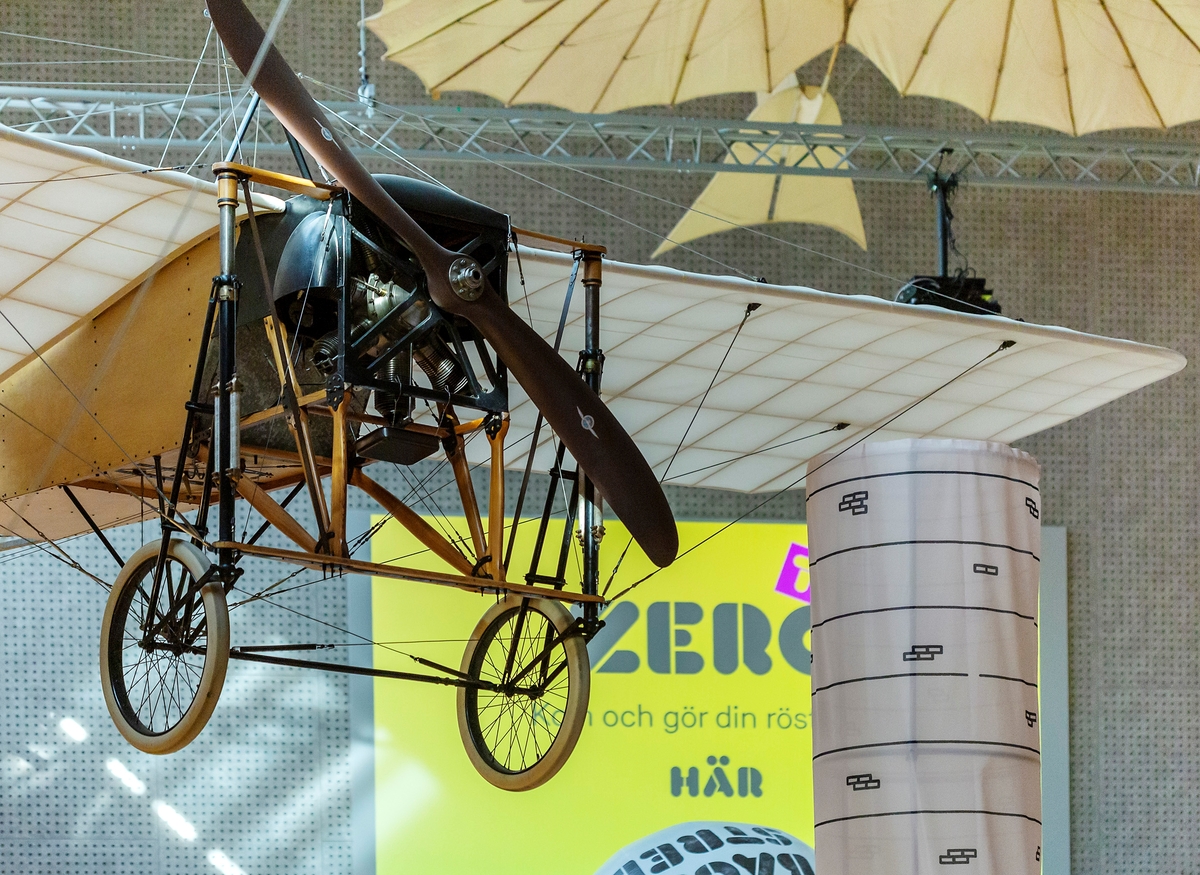 Utställningen Zero City, interiörbild. Tidiga flygplan.