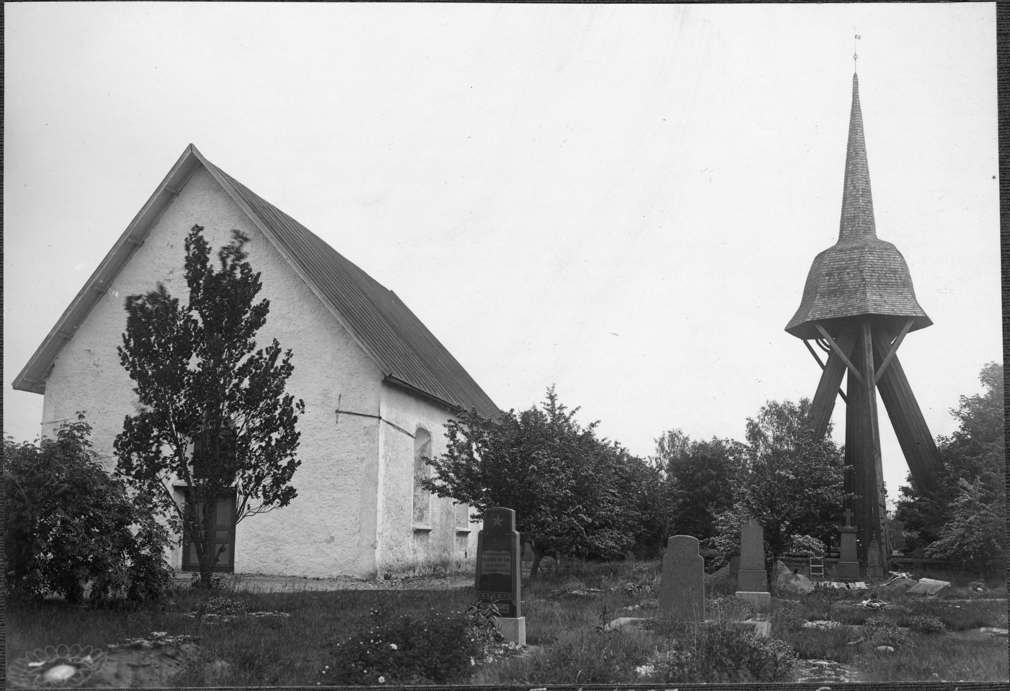 Kyrkan, klockstapeln och kyrkogården mot väster.