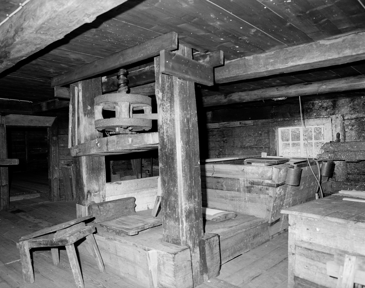 Ösjöfors handpappersbruk. Verkstugan med våtpress och kyp..