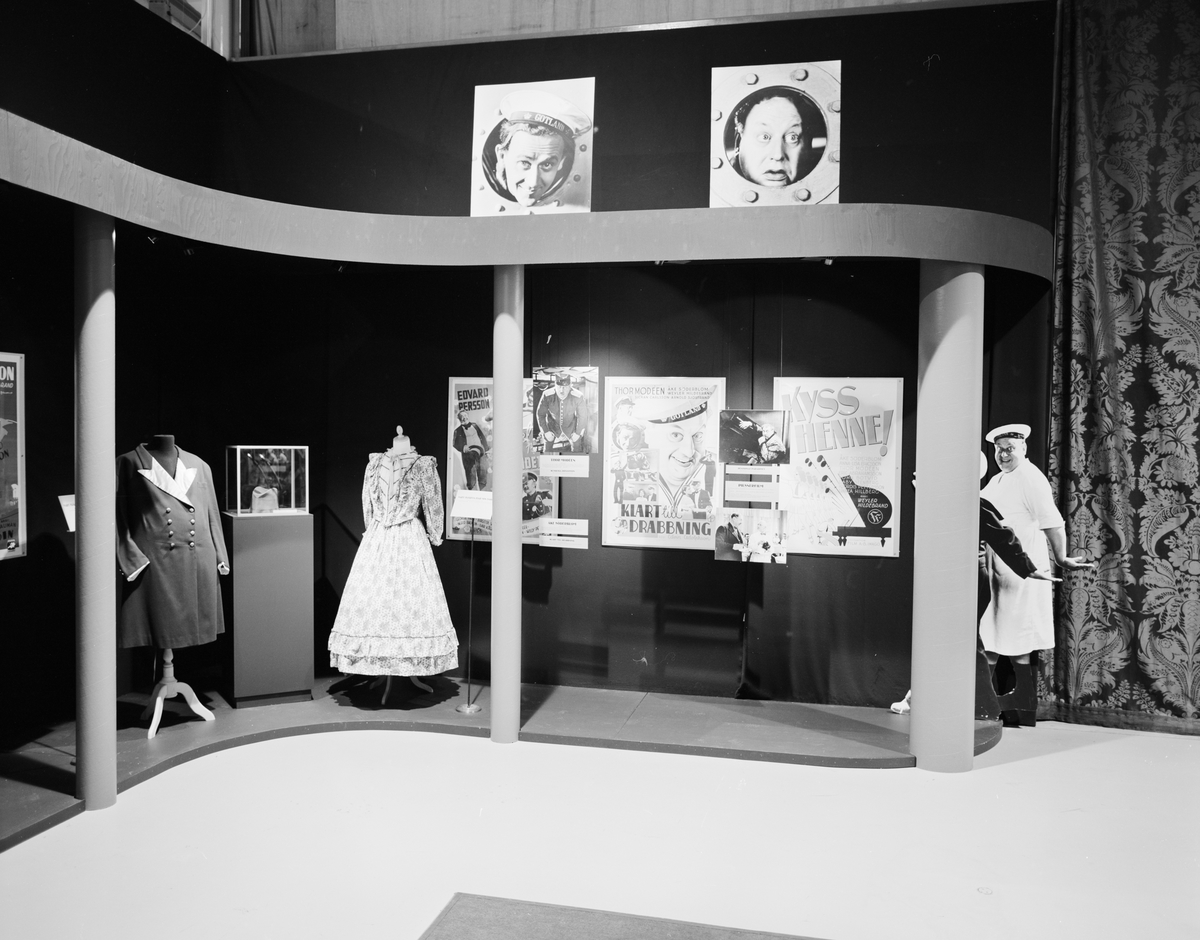 "Svenska filmkomiker". T h 2 st dräkter ur Edvard Perssonfilmen "Vart hjärta har sin saga" från 1948. Burna av Edvard persson och Dagmar Ebbesen. Inför filmen 100 år gjordes en utställning "Magiska Bilder komik, erotik,>> optik" den 26 april - 12 jan 1997. Producerad av Svenska Filminstitutet i samarbete med Telemuseum och Tekniska Museet. Formgivning Mikael Sylwan och ulrika Wolff. Idé och koncept Anna-Lena Wibom.