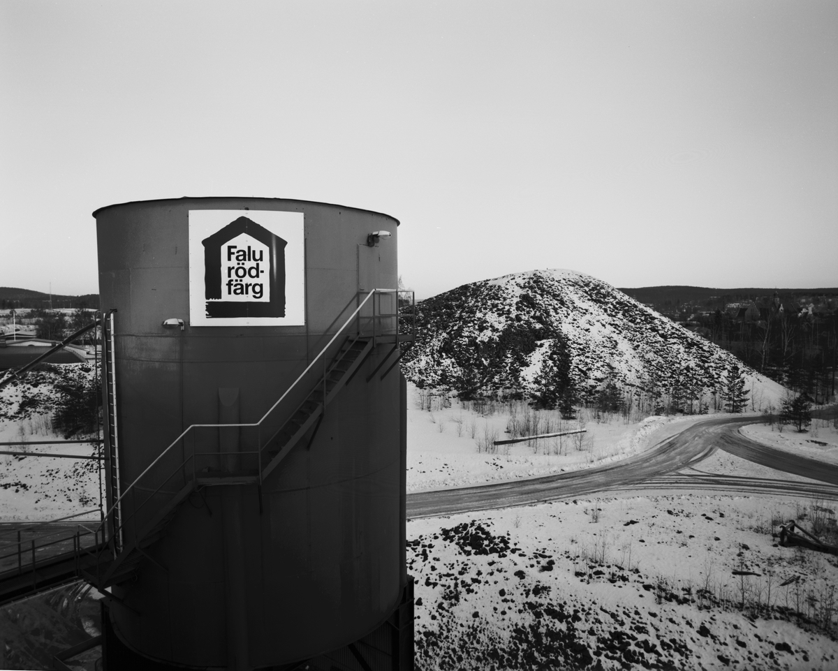 Bulksilo, lager för färdigmalt pigment ca 150 ton. Silon kommer från Grängesberg, f.d. "apatitficka", flyttade till Falun 1993. Högen i bakgrunden kommer från Östra Hårdmalmen i Falu gruva, känt för stort guldinnhåll. Högen är K-märkt.