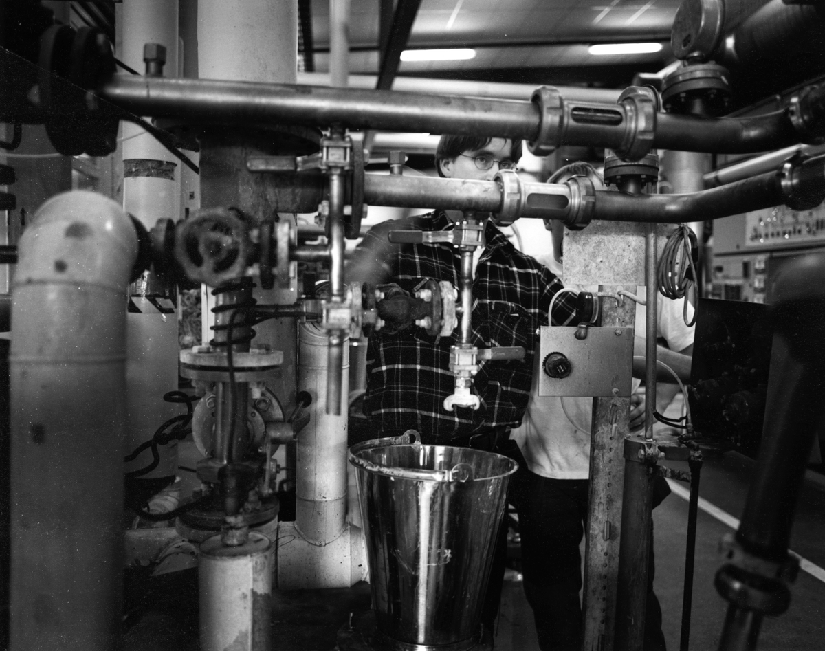 Håkan Palm tittar på tvålflödet i synglasen, så att den har rätt "färg". Det får inte vara för grumligt och inte för klart.