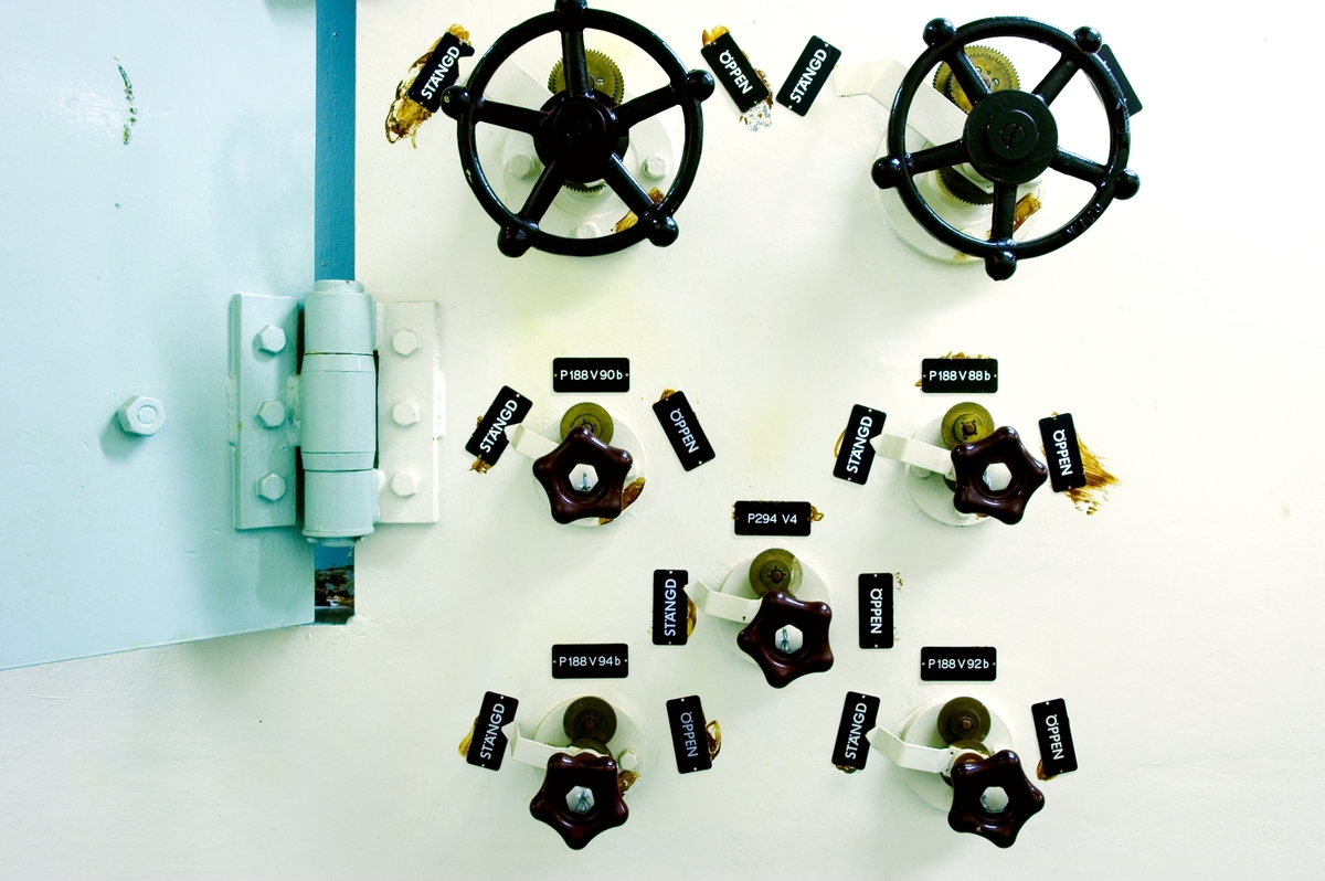 Titel: Ågesta kärnkraftverk. Under 2005 gjorde Tekniska museet tillsammans med Stockholms Läns Museum och Länsstyrelsen i Stockholms län en fotodokumentation av Ågesta kraftvärmeverk, Sveriges första kommersiella kärnkraftverk, Foto: Nisse Cronestrand. Bildbeskrivningar: Ingenjör Åke Bergman. Bilden föreställer: Plan 20RB korridor 2025. Fjärrmanöver av ventilerna i system P188, P248 samt P294 placeerade i rum 2026 som är kopplingsutrymme för D2O-jonbrytare. Installationer: P188, P201, P248 samt P294. Förklaring av system framgår av rapport :Statens Vattenfallsverk A23/60 5/4 1960.
