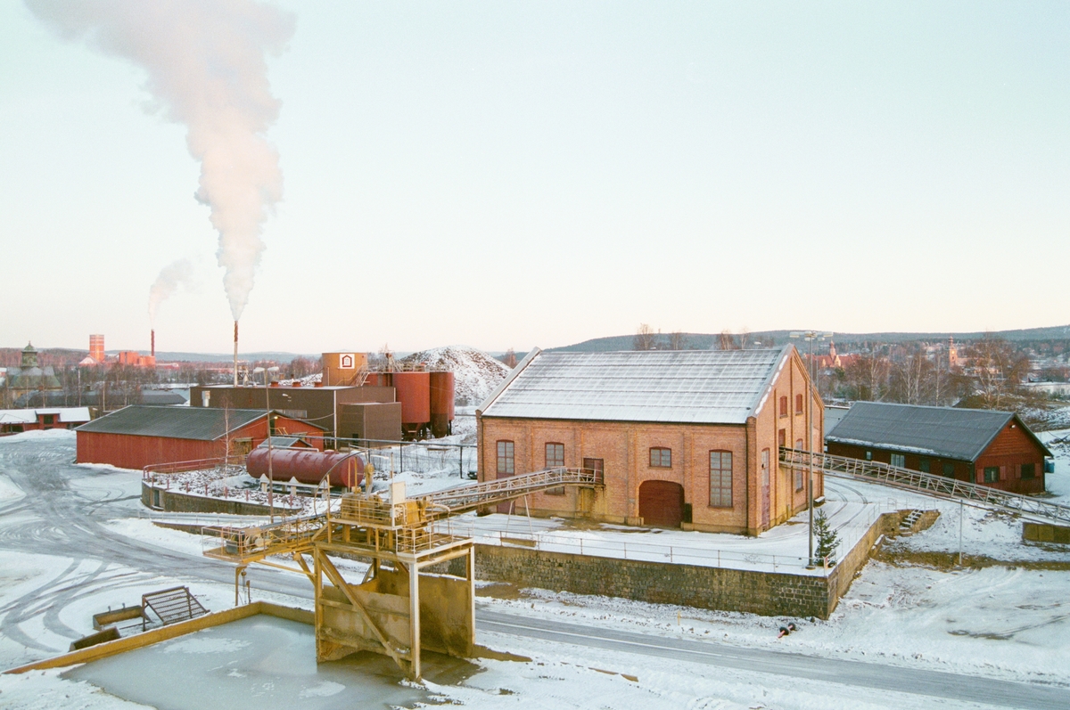Exteriör. Byggnaderna en vintermorgon, i förgrunden slammeriet.