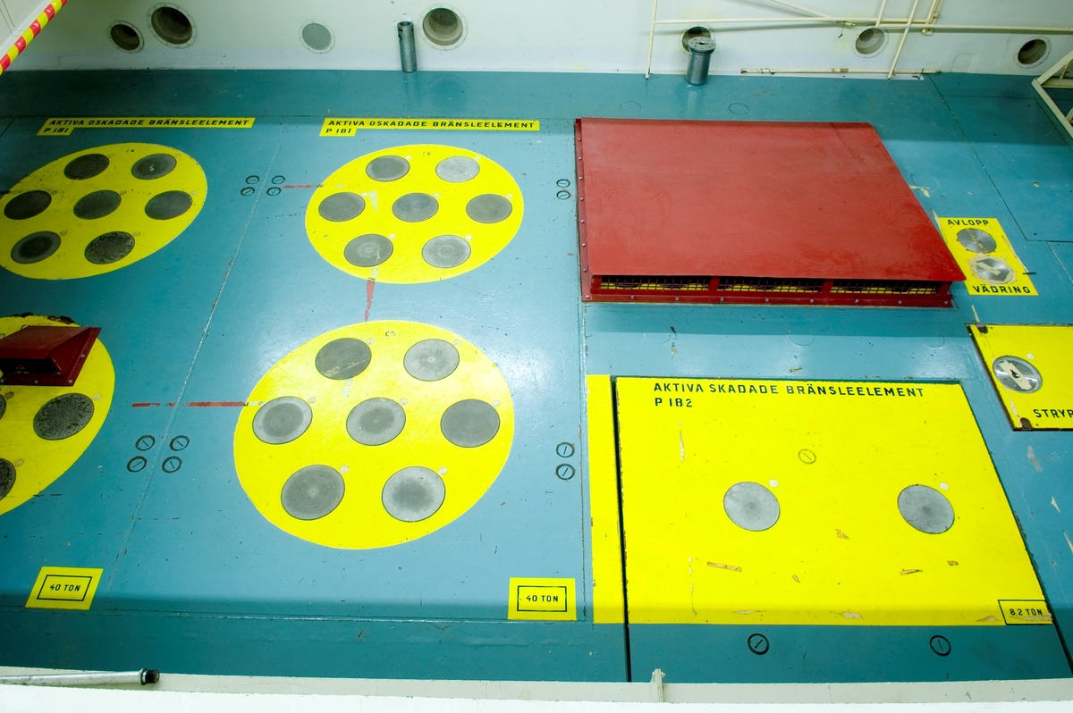 Bilden föreställer: Plan 26 RB rum nr. 2606. Reaktorhall mot söder. Laddränna 2401. Från vänster: P181 förråd för aktiva och oskadade bränsleelement, 6 förvaringsbrunnar med vardera 7 positioner och plats för 4 bränsleelement i varje position. Plats för sammanlagt 4x7x6 =168 bränsleelement. P182 är förråd för aktiva och skadade bränsleelement. P183 är förråd för aktiva styrdon och under det röda plåtlocket förråd för 30 kontaminerade (aktiva) styrdon. Till höger om P183 position för avlopp respektive vädring av laddmaskin. Förklaring av system framgår av rapport: Statens Vattenfallsverk A23/60 5/4 1960.