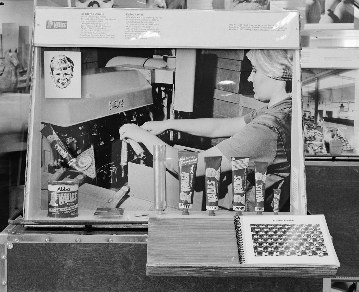 Dokumentation av den lilla utställningen av "Kulor, Krus och Kaviar". Sätts upp på Västerås stadsbibliotek. Vandringsutställning. Samarbete mellan Tekniska museet och Riksutställningar. Kalles kaviar-monter.