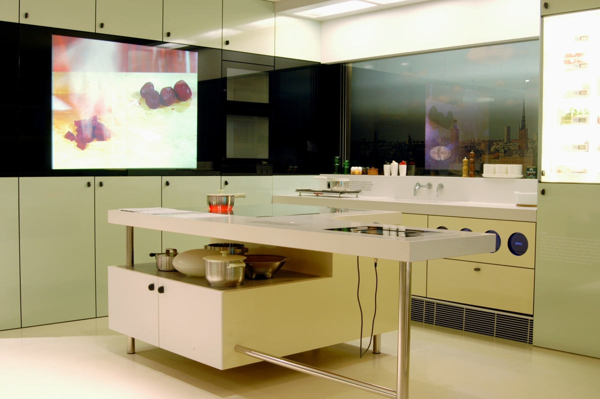 Tänk om. En utställning på Telemuseet om hur det skulle kunna se ut i framtiden i våra hem. I utställningen ingår en film em en familj som skulle kunna tänkas bo i detta hem. Det är ett kök, vardagsrum, sovrum, badrum, uterum och hall. Möbler och teknik som rummen är utrustade med är utvecklat och designat utifrån ett tänkbart framtidssenario. Detta är köket med sitt kylskåp som har hyllor för veckans dagar och en skärm som visar matlagnings program.
