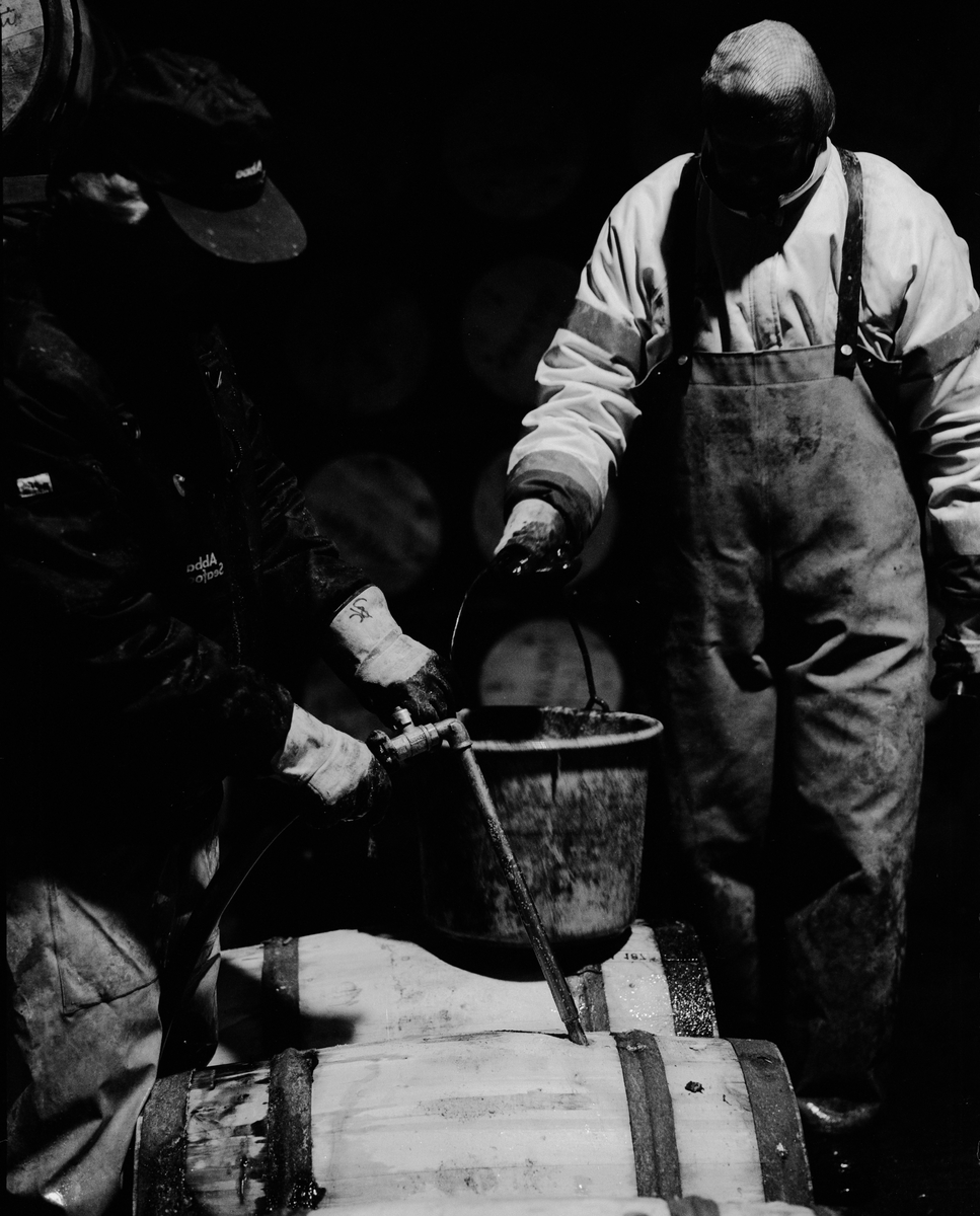 Ingvar Örtengren och Bengt Karlsson kontrollerar att tunnor innehållande sockersaltad torskrom är väl förlakade. På grund av emballagets beskaffenhet samt med hänsyn till volymminskning vid nedkylning måste tunnorna med jämna mellanrum efterfyllas med lake.