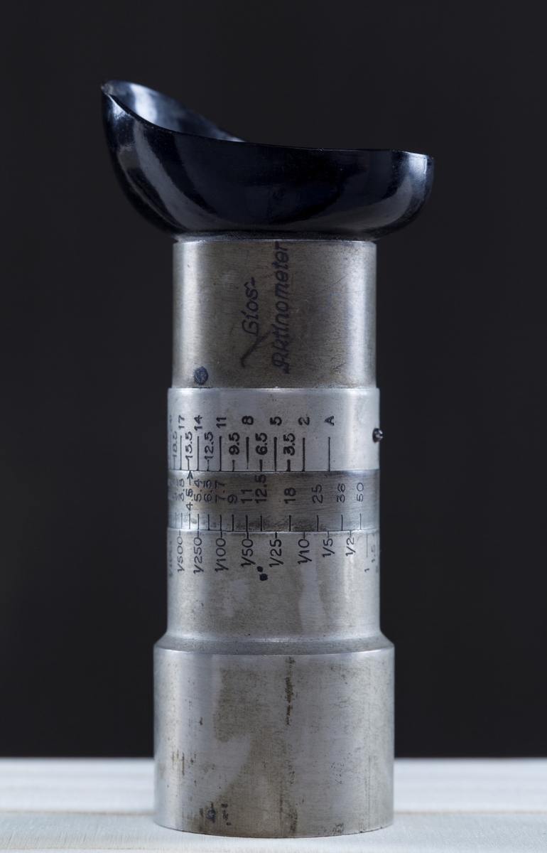 Exponeringsmätare, optisk. "Lios Aktinometer". Cynlindrisk, med vridbar, kilformad spalt som reglerar ljusstyrkan i mätfältet.