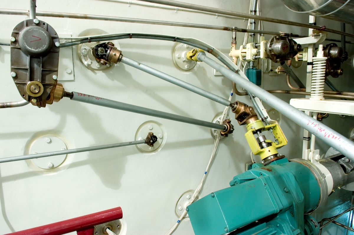 Bilden föreställer: Plan 26 RB rum nr. 2661 expansionsutrymme. Arrangemang av ventilmanöver på andra sidan av strålskyddsvägg. Rattstång genom väggen, kulkoppling, manöverstång, kulkoppling,växel samt ventilspindel. Förklaring av system framgår av rapport :Statens Vattenfallsverk A23/60 5/4 1960.