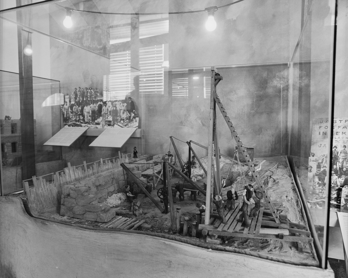 I montern, en modell i skala 1:20, hur arbetet gick till med grunden på Surbrunnsgatan 11.