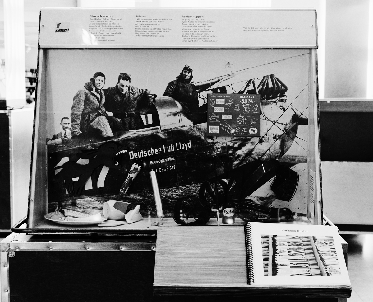 Dokumentation av den lilla utställningen av "Kulor, Krus och Kaviar". Sätts upp på Västerås stadsbibliotek. Vandringsutställning. Samarbete mellan Tekniska museet och Riksutställningar. Karlssons klister-monter.