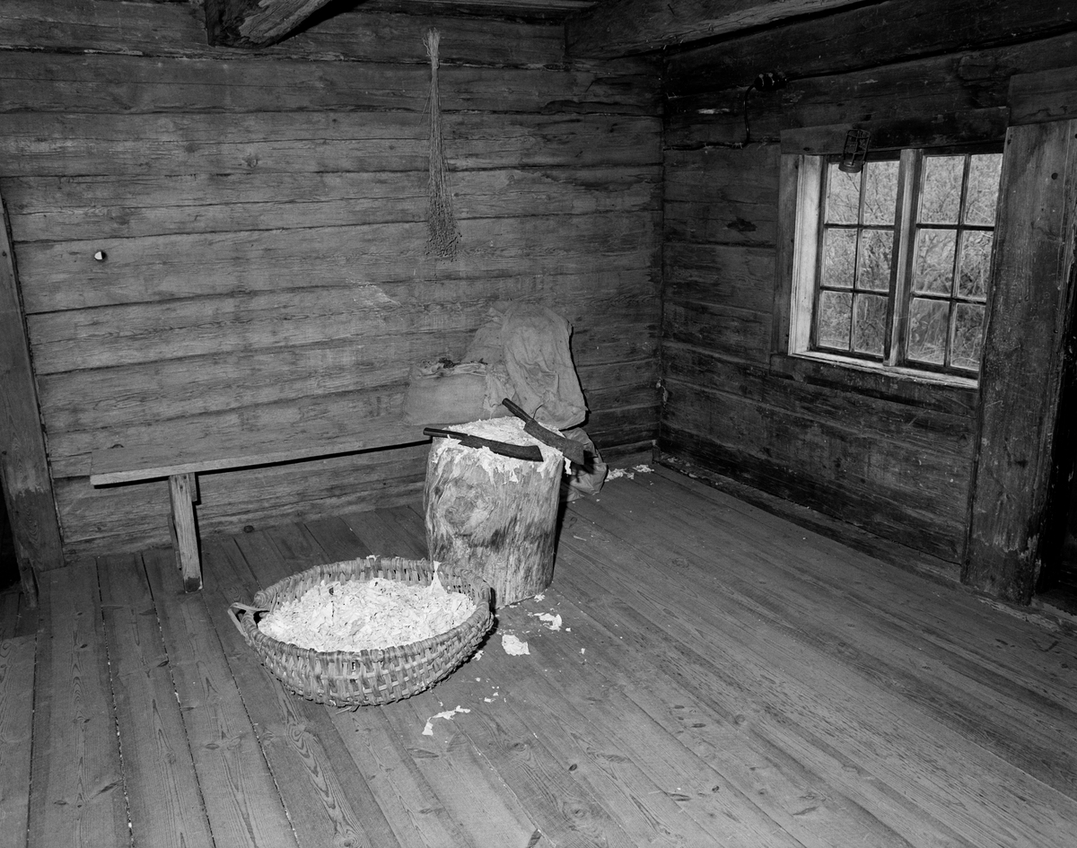 Ösjöfors handpappersbruk. Huggkubbe med lumphackor och korg för uppsamling av lump på torkloftet.