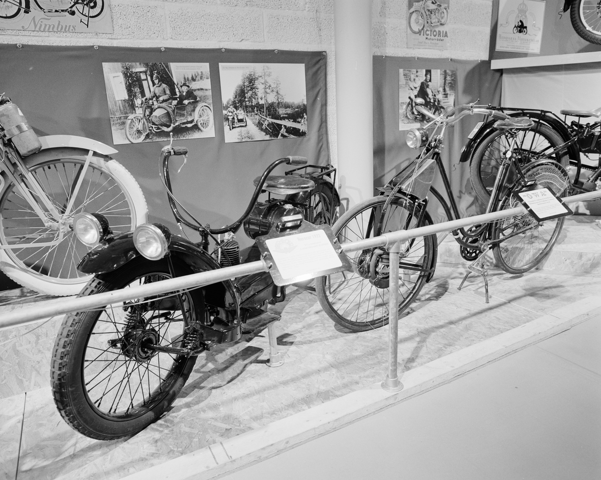 Dokumentation av "Motorcykeln 100 år" i Wallenberghallen. Motorcykel, New-a-car??, ÖWA hjul.