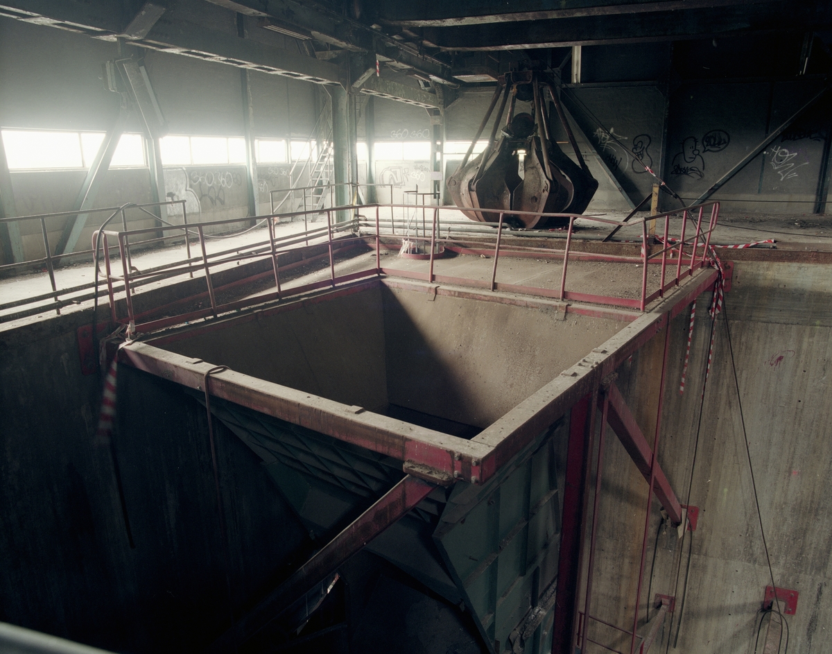 Bildtext: Lövsta sopförbränningsanläggning 2004. Tratt genom vilken man lastar transportbandet som går från sopförbränningsnläggningens bunker till LÖMAB, 1970-talets försöksanläggning för automatisk sopsortering.
