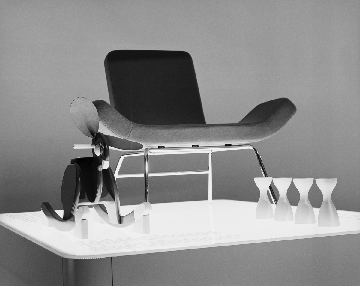 Fåtölj, ljusstake och gungkanin.
