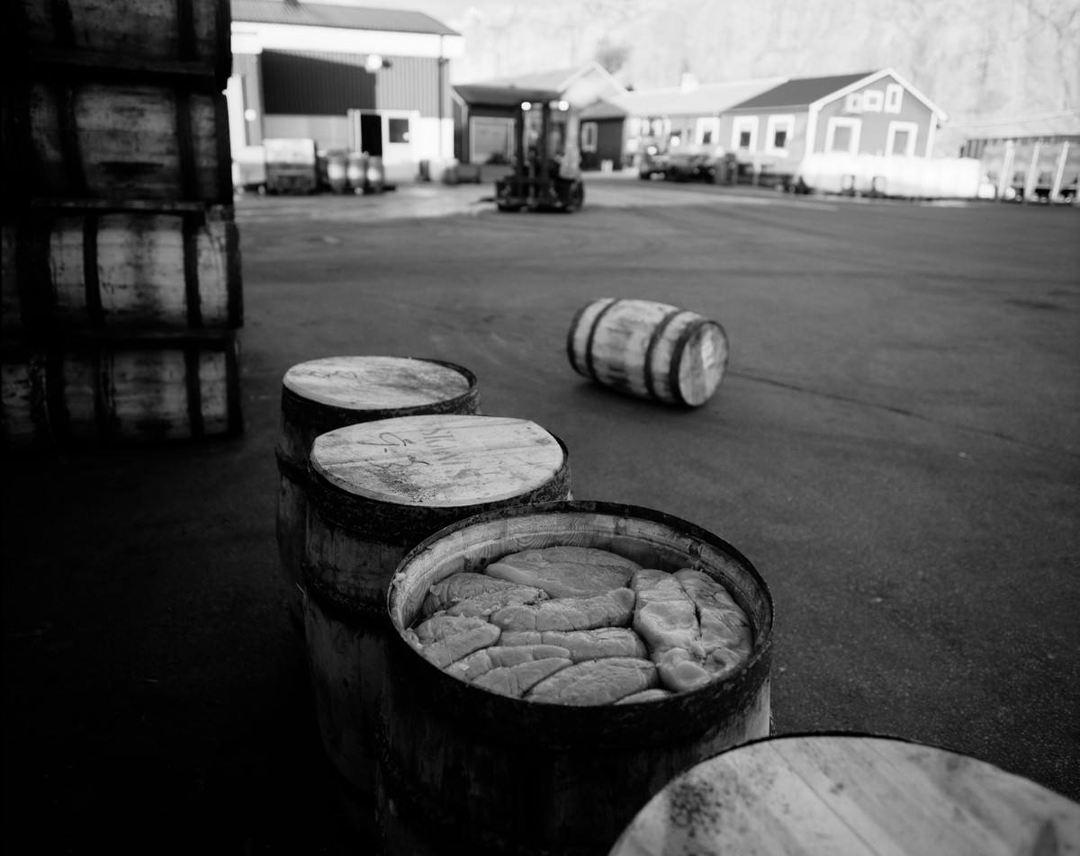 Sockersaltad torskrom i trätunnor har rests för okulärbrsiktning vid Abba Seafoods råvarulager, Bergrummet i Kungshamn.