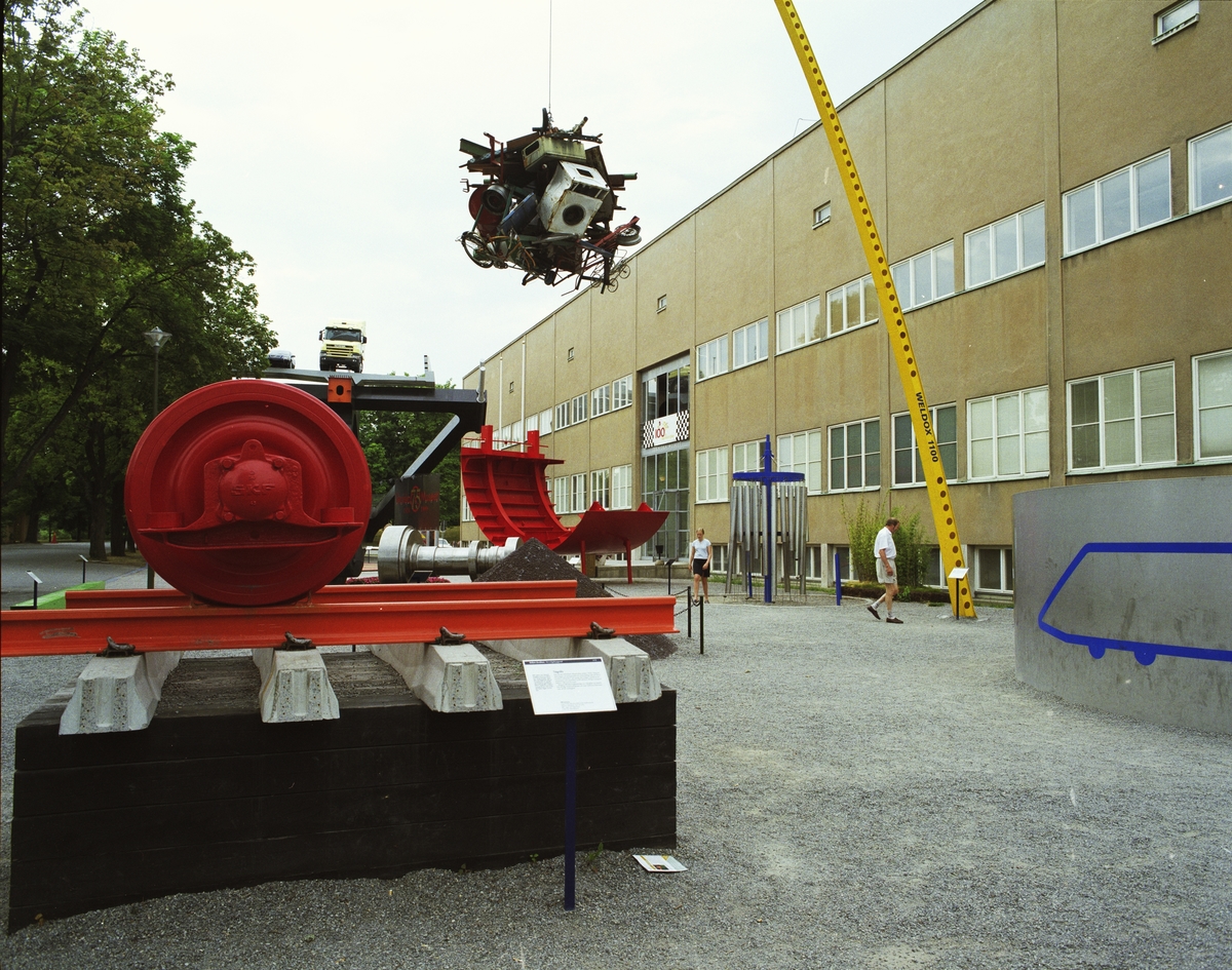Utställningen "Stålets ansikte". Delar av tågräls utanför Tekniska museets entré.