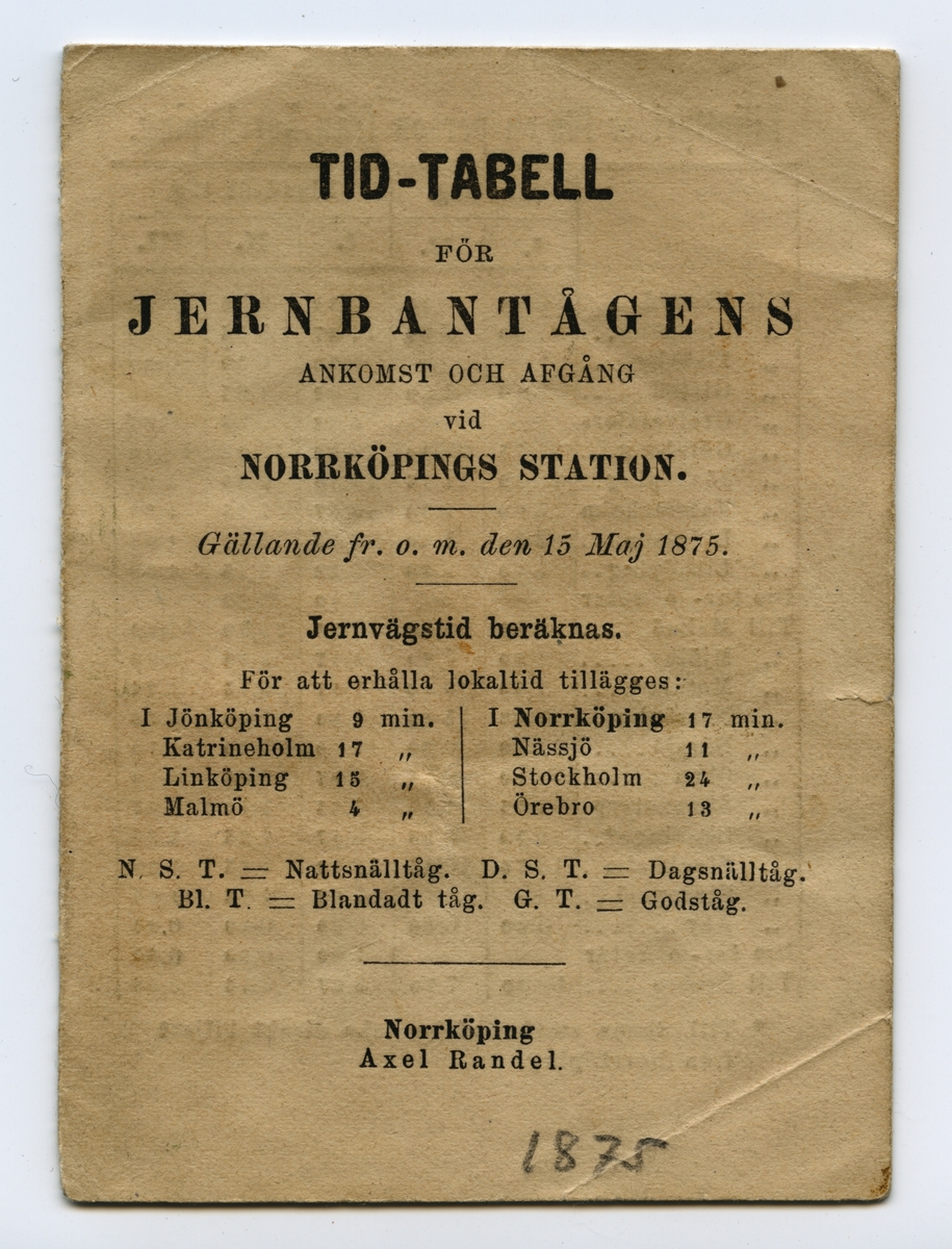 Tågtidtabell med angiven lokal tid för Norrköping. 1875.