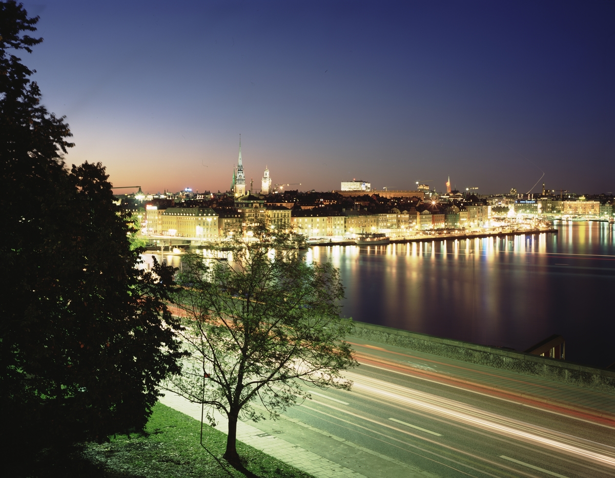 Nattbild. Vy över Riddarholmen. Fotograferat från Stadsgården.
