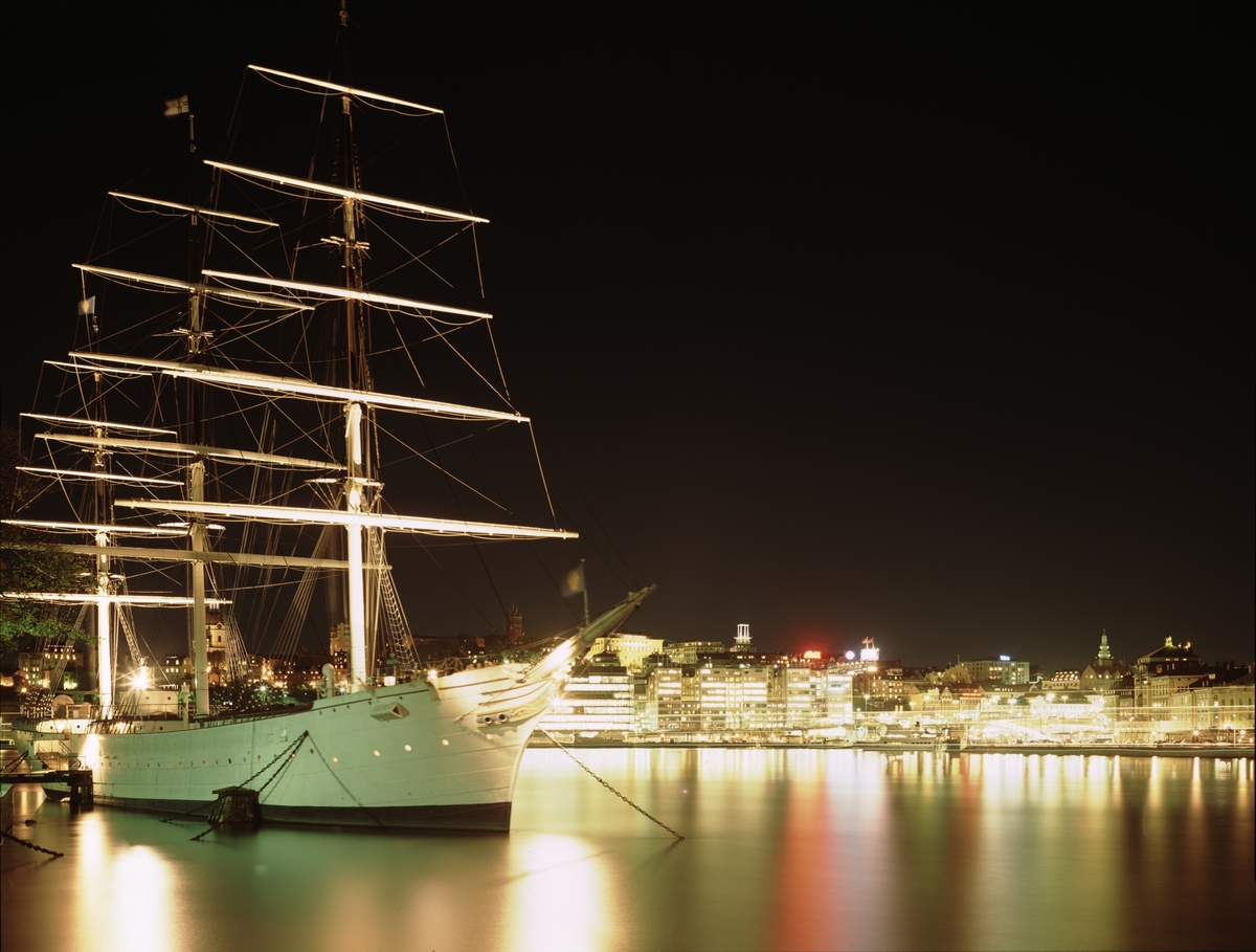 Nattbild. Fartyget af Chapman, är numera vandrarhem vid Skeppsholmen. Staden i bakgrunden. Fotograrat från Skeppsholmen.