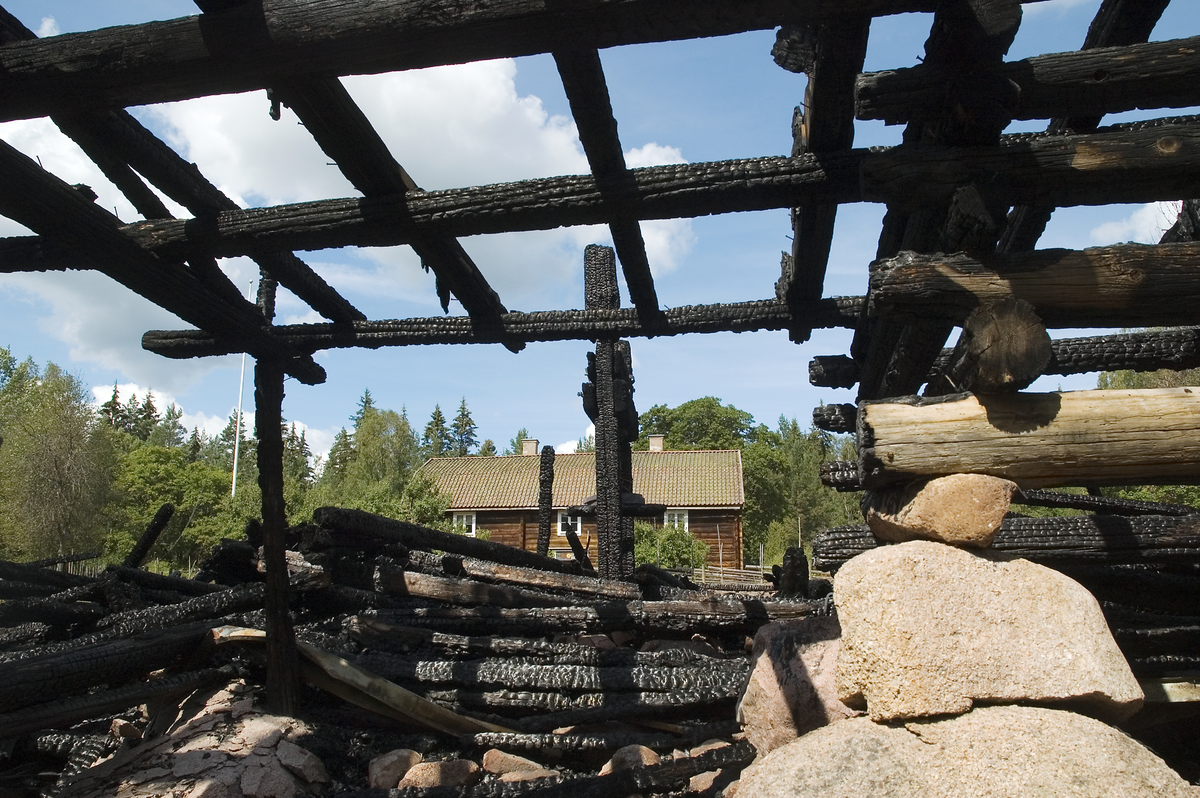 Från brandplatsen, rester av handpappersbruk, en del av vattenrännan med mangårdsbyggnad i bakgrunden