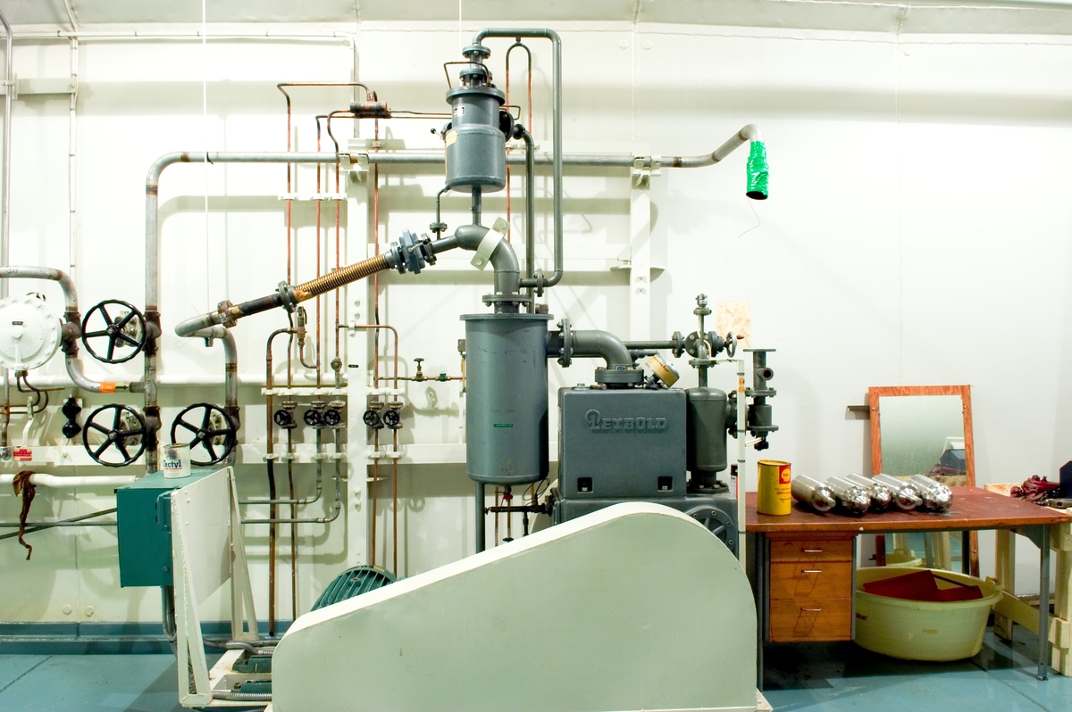 Bilden föreställer: Plan 26 RB rum nr. 2661 expansionsutrymme. Kompressorutrustning som användes vid tömmning och torkning av systemen. På bänken ligger tätningspluggar som användes vid tätning av bränsleelementsposition i reaktortank när ändring av antalet bränsleelement gjordes. Förklaring av system framgår av rapport :Statens Vattenfallsverk A23/60 5/4 1960.