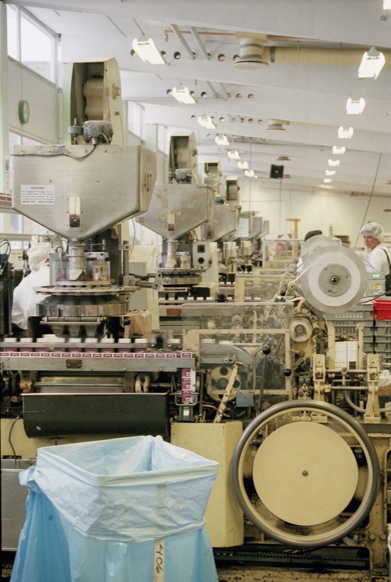 Dokumentation av Läkerol tillverkningen på Malaco Leaf i Gävle. Här är förpacknings maskiner för Läkerol askar.