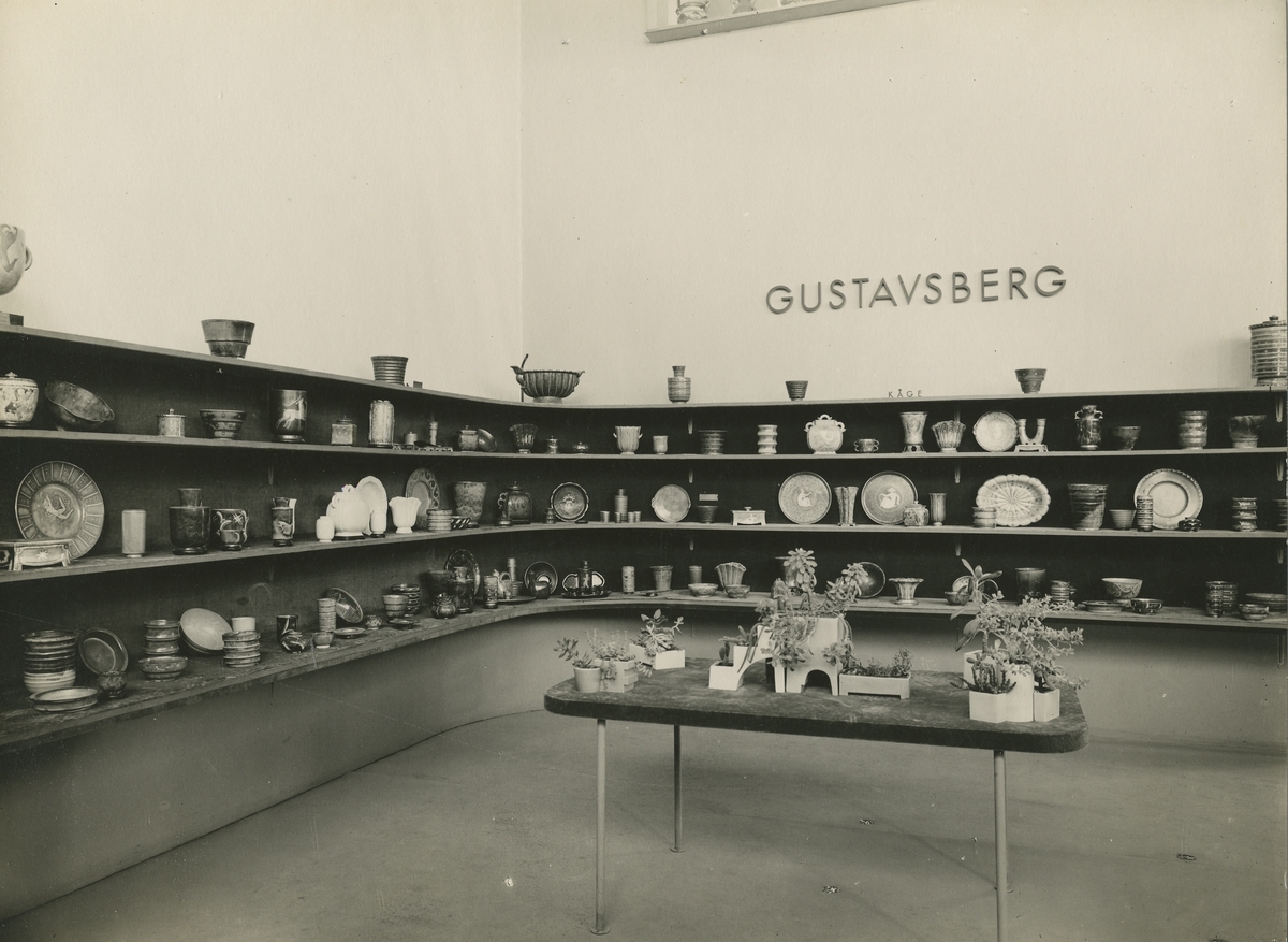 Gustavsbergs monter, Stockholmsutställningen 1930. Föremål i Argenta,, Farsta, Carraca, (blå & vit) och kaktusstället Puzzle. Allt utställt för första gången. Konstnär Wilhelm Kåge.