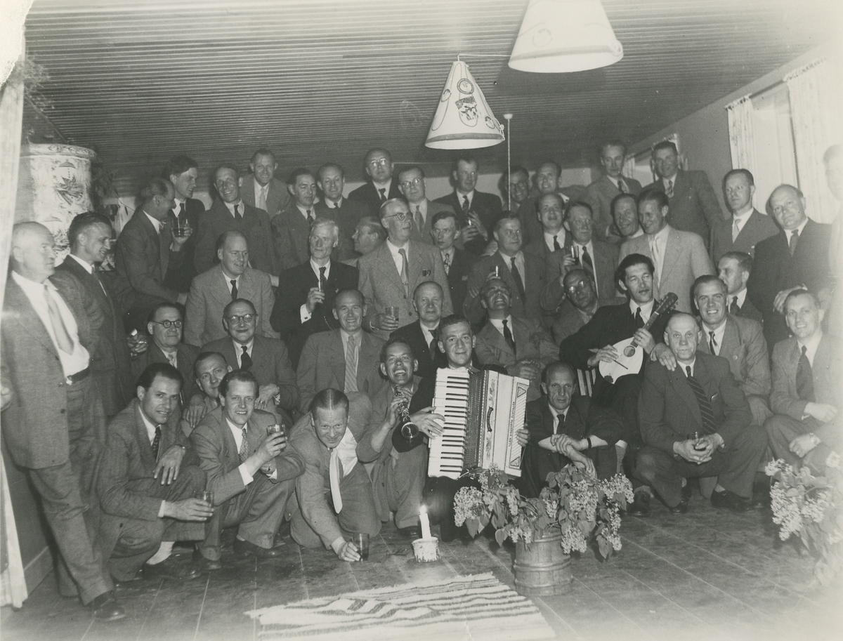 Personer: Bilden visar bl a Berndt Friberg, Lennart Elofsson (med dragspel) Calle Blomqvist (med mandolin), Harry Pettersson, Oskar Wadström.
