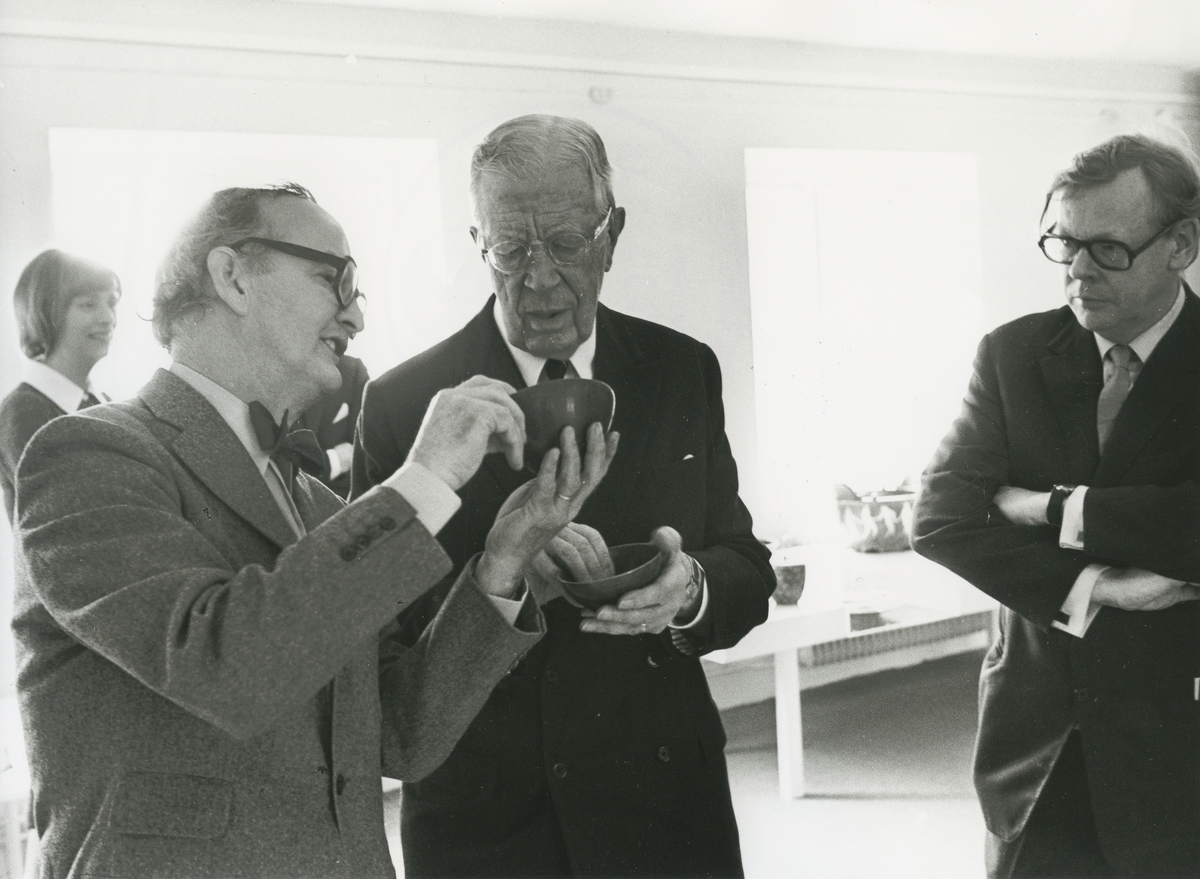 Titel: Kungligt besök på Gustavsbergs porslinsfabrik. Stig Lindbeg förevisar stengods, sannolikt i Gustavsbergs Studio. Personer: Kung Gustav VI Adolf, Stig Lindberg, Arthur Hald.och Lisbeth Enzell.
