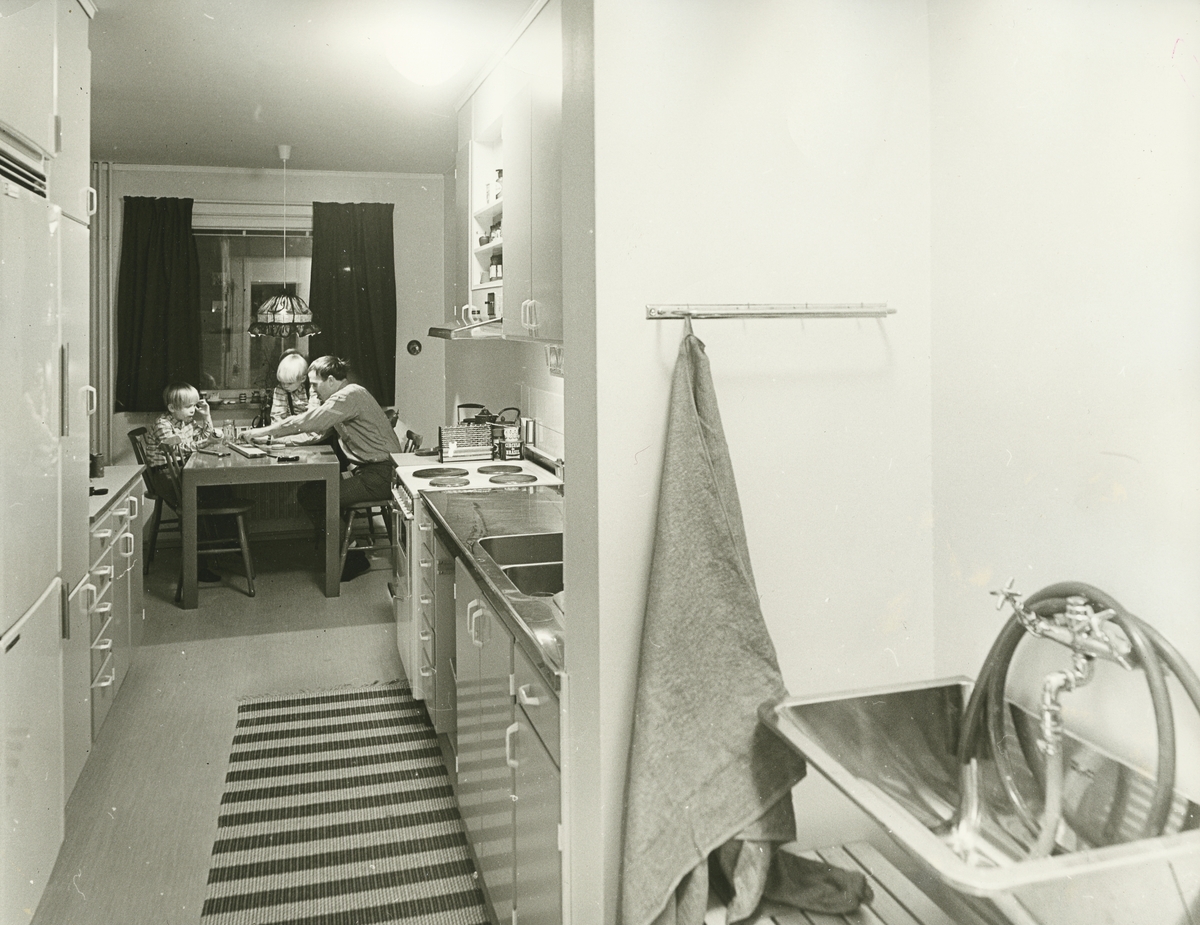 Interiör. Modernt utrustat kök, troligen i radhus.